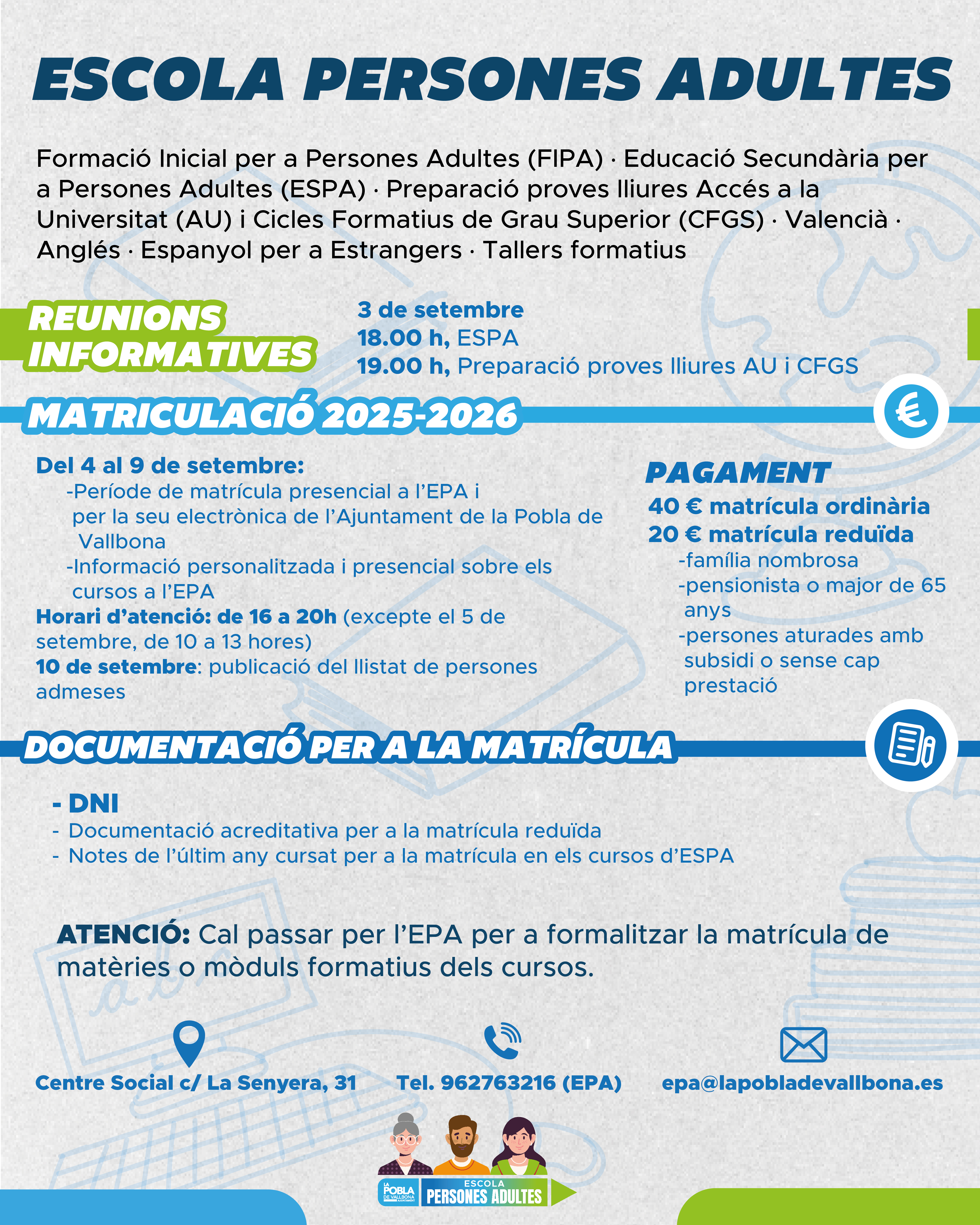 ℹ️ La matrícula estarà oberta del 4 al 9 de setembre. Per a més informació podeu passar a informar-vos al Centre Social o enviar un correu a epa@pobladevallbona.es