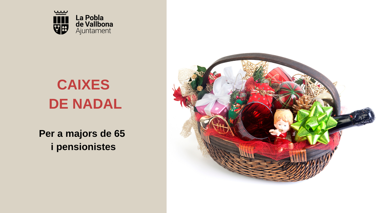 Els dies 21, 22 i 23 de desembre de 9 a 13 hores es repartiran al Centre Social les caixes de nadal als majors de 65 i pensionistes.